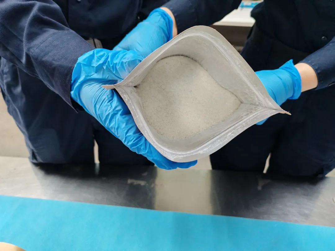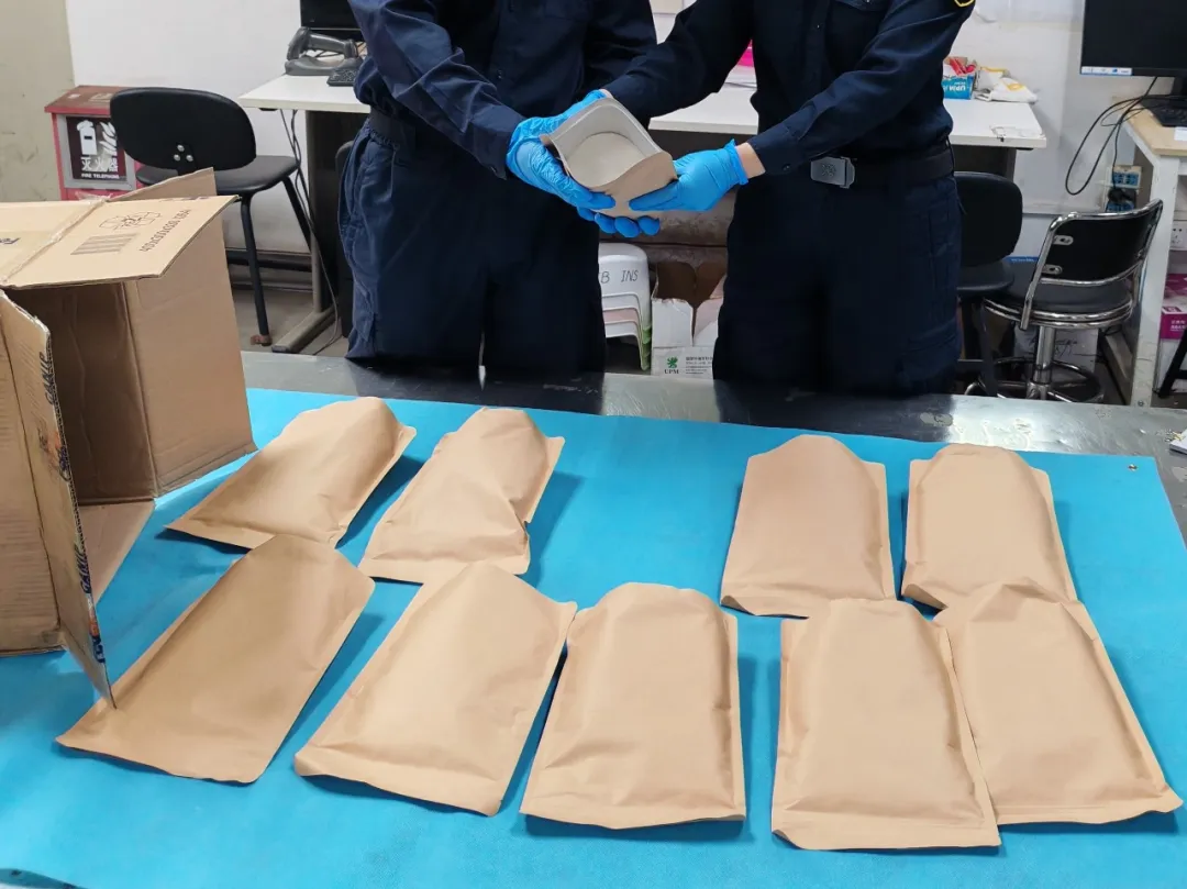 海关关员随即拦截并进一步查验,发现该票快件内有10袋用牛皮纸密封袋包装的白色晶体状物品。